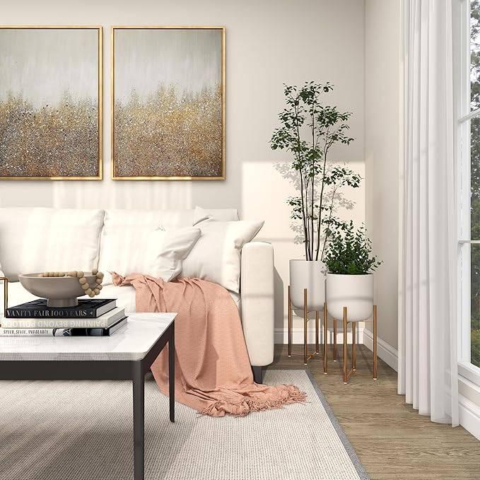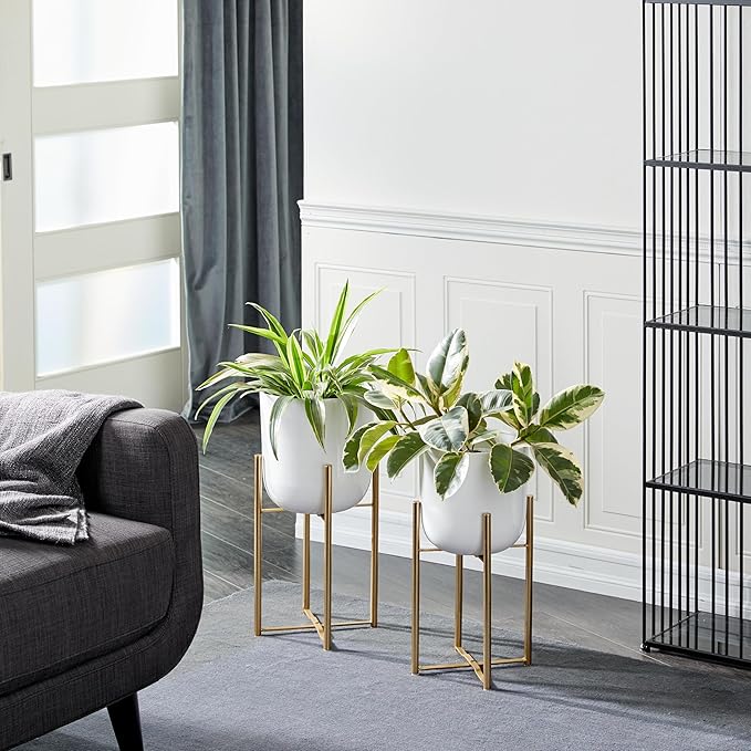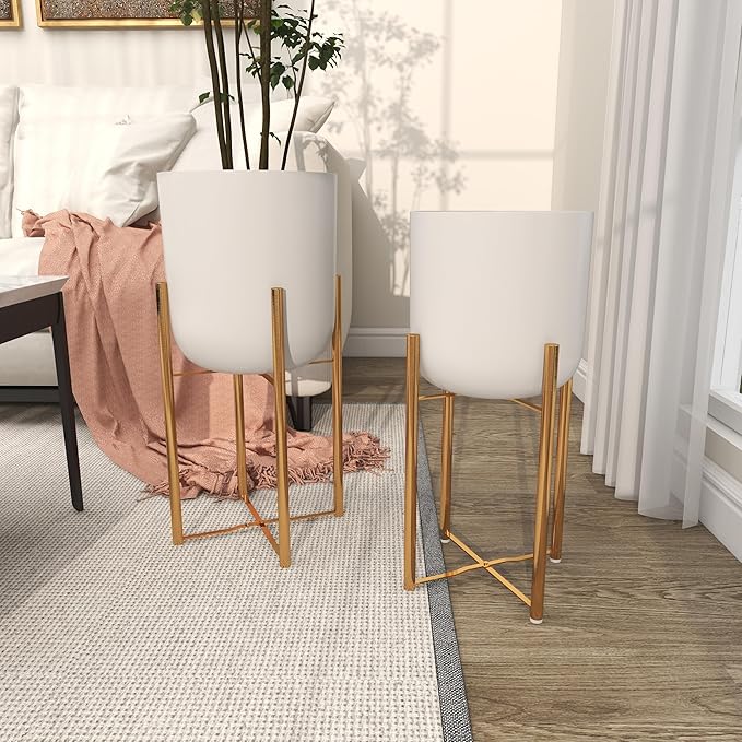 - WHITE AND GOLD FLOWER POTS FOR INDOOR PLANTS: Round plant pot set has a stunning in a crisp, clean white color with a polished finish and gold colored stand