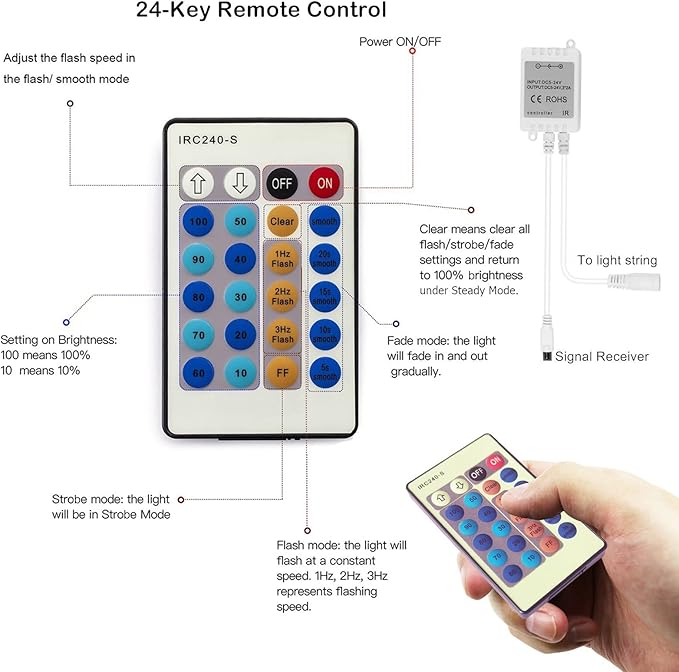 - π Multi-function Remote Control: Updated Remote Controller with short-circuit protection, with this remote, it is easily to turn on/off, adjust the brightness, switch from flash to smooth to steady on or changing flashing speed.