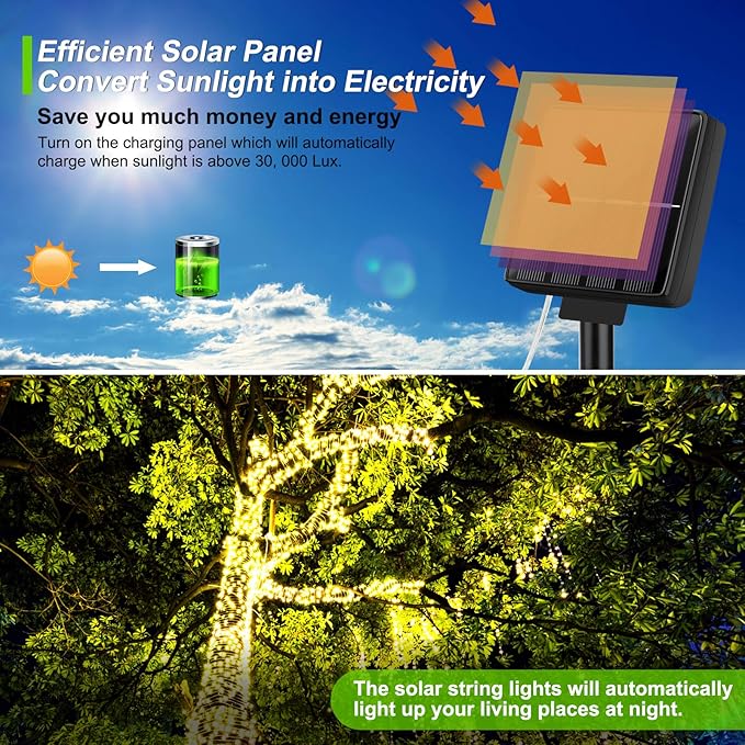 - 【Eight Romantic Lighting Modes】These solar string lights feature eight lighting modes, including steady on, combination, in waves, sequential, slow-glow, chasing, slow fade and twinkle. Different lighting settings produce different lighting atmosphere. So you could choose your preferred lighting mode to decorate your home in special festivals or brighten up the exterior of your home at night