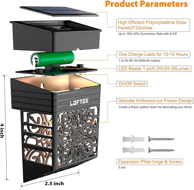 - 【Solar Fence Lights for Ambience】- LOFTEK warm white solar fence lights adopts advanced LED chips and all side Hollowed-out visible lampshade design provides brighter lighting and a wider detection range. It cast a pretty flower pattern that looks gorgeous and adds a nice aesthetic to your garden backyard. 26 lumens brightness is eyes protection and energy-saving than general fence lights. With our solar outdoor lights, you will get many compliments from neighbors.