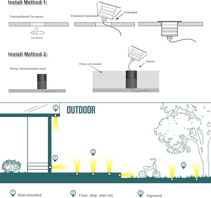 - PACKAGE INCLUDED - 2 x LED Step Lights, 2 x Ground Embedded Parts. Each LED Deck Light is lengthened with 11.8 inch(30cm) wire.