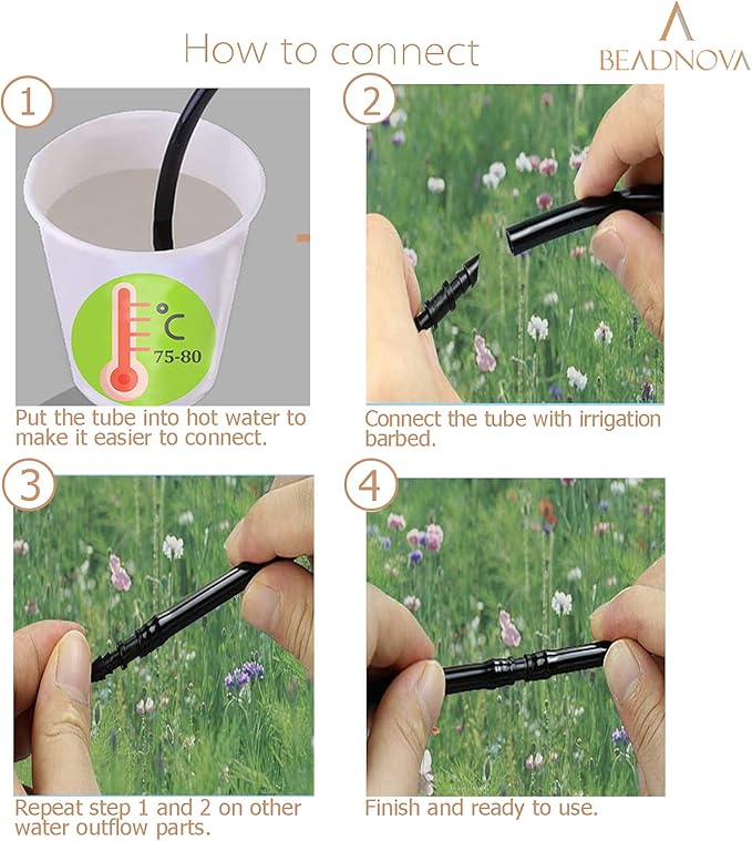 - NO TOOL INSTALLATION: Connect two sections of irrigation tubing by simply insert this barbed connector at the ends of the tube. No tools or glue required. Push the tube firmly into the irrigation barbed to avoid leakage. Soften the end of tube with blower if you find the tube is too stiff before inserting.