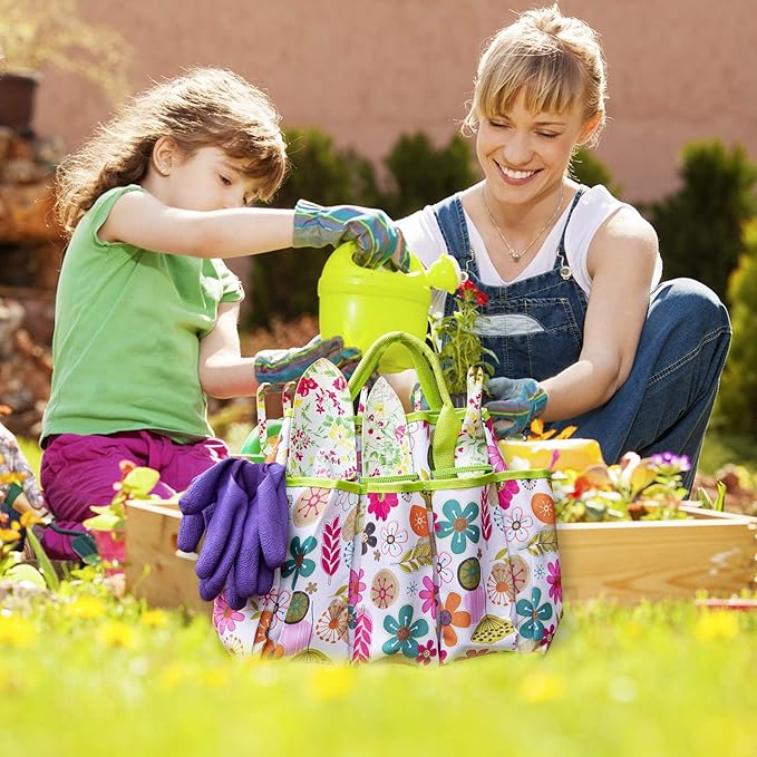 - All-in-one Gardening Kit: 10 piece garden hand tool kit includes trowel, transplanter, hand rake, cultivator, weeder, pruning shears, kneeling pad, garden gloves and cleaning cloth. Also come with a unique floral print tote with multi exterior side pockets to organize different kinds of hand tools and gardening necessities