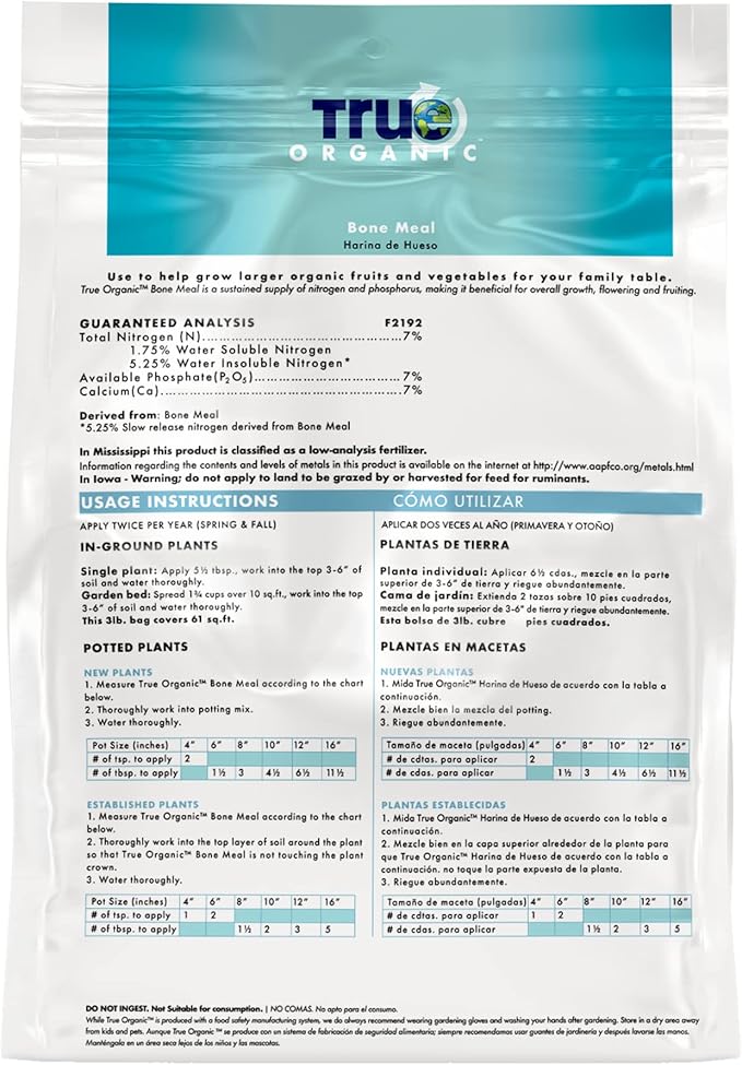 True Organic Bone Meal – Organic Fertilizer for Growth, Flowering, and Fruit Production – 3lb Bag Covers 61 Sq. Ft.