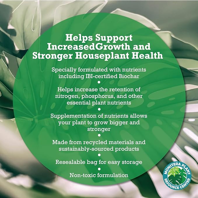 - SUPPORTS INCREASED GROWTH AND STRONGER HOUSEPLANT HEALTH Specially formulated with nutrients including IBI-certified Biochar, which increases the retention of nitrogen, phosphorus, and other essential plant nutrients so your plant can grow bigger and stronger.