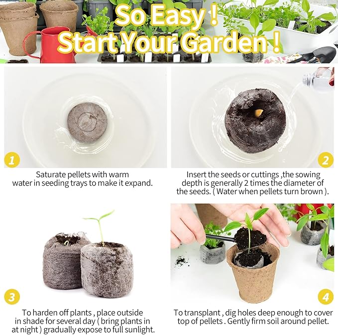 - Premium Material: Peat pellets are made of peat, which has great aeration and water retention, so it is beneficial for plants to help plant growth, and can be completely degraded; They are small and compact, easily and cleanly storable, easy to transition into bigger containers