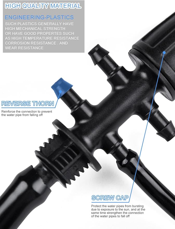 - Easy installation: It can be installed easily without glue, tools or fixtures. The irrigation fittings are anti-drop and can be tightly secured by simply pressing the barb into the tube.