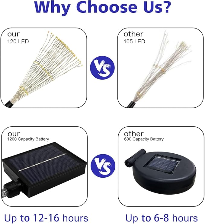 - [Continuous Lighting For 12~16h] While most brands use 600 capacity battery, Unihoh solar garden fireworks lights are equipped with 1200 ultra-large capacity rechargeable battery, which is able to provide 12-16 hours of continuous lighting after 4-6 hours of full charge while others can only work 6-8 hours.