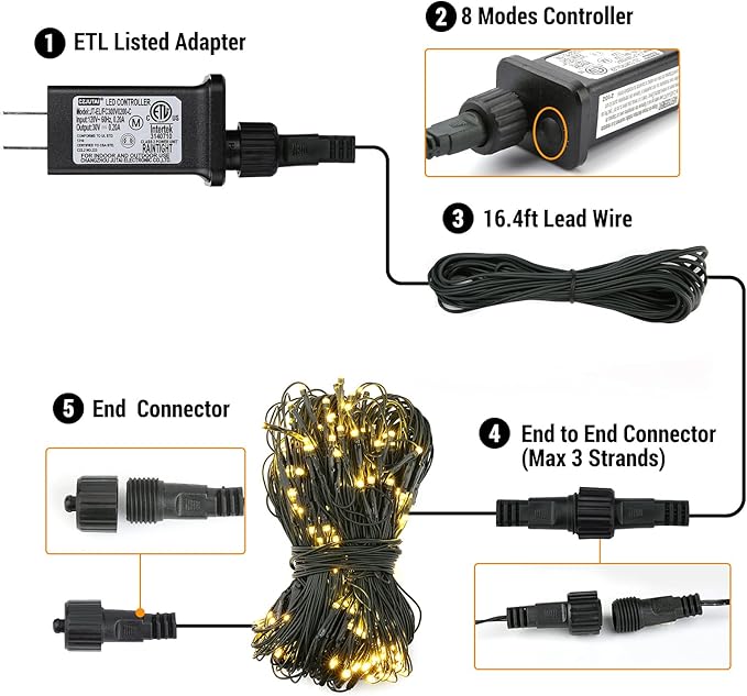 - Low Voltage & Connectable: The output voltage of the adapter Christmas net lights is 30V, lower than standard safe voltage 36V to ensure your safety. Compatible with all of USA standard outlet, the power is only 6W, with ETL Certification, that is safe and energy saving. And it comes with end to end connector, can be connected for 3 net string lights.