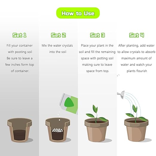- EASY TO USE: Just mix the water storing crystals with your potting soil evenly throughout the root zone. After planting just water to allow granules to absorb maximum amount of water. This will effectively reduce the amount of watering needed. Use 7 teaspoons of crystals per 6-foot