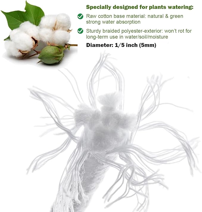 - Size Length Diameter: 30 feet long, 1/5 inch diameter. It is perfect for DIY self-watering device, wicking material for plants, self-watering drip irrigation waterer, indoor plant watering device system, vacation plant waterer, vacation plant treatment, vacation plant watering device system and automatic waterer for potted plants, automatic watering dripper kit, African violet wicking pots and self watering planter pot