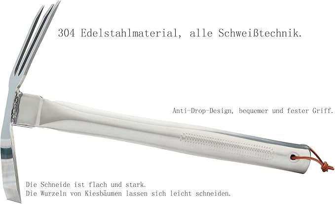 - 【Garden pick and hoe】. Our picks and hoes are welded in 416 stainless steel. Can be used for more than 10 years. The sharp stainless steel garden hoe is great for weeding, breaking up compacted soil, roots and digging trenches.