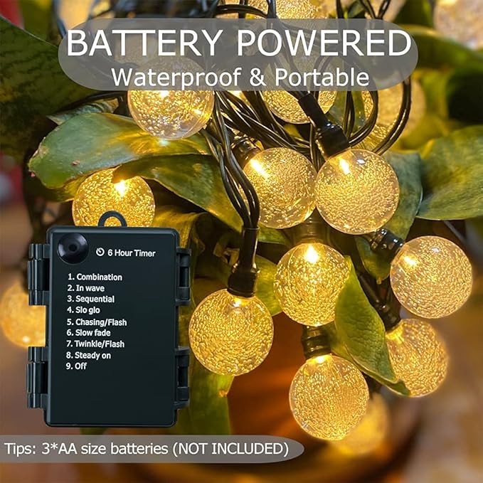 - BATTERY OPERATED GLOBE STRING LIGHTS - The premium quality LED string lights are powered by 3*AA batteries (not included) that can be used in anywhere (indoor and outdoor decoration). Portable crystal ball string lights are easily carry and decorate home garden bedroom anywhere and various festivals. 30 LED globe lights can transform your gazebo or porch into a retreat.