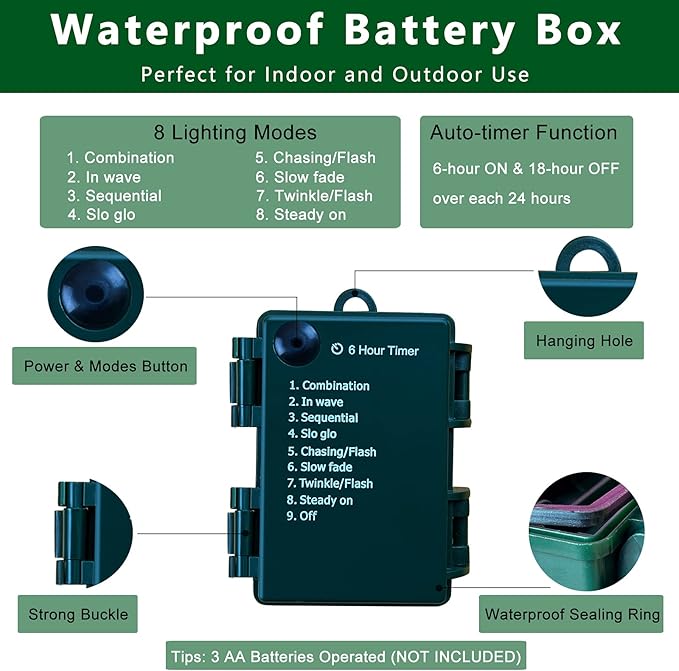 - 8 LIGHTING MODES WITH TIMER FUNCTION - Globe string lights with timer function. 8 lighting modes available to satisfy your diverse needs: Combination, In Wave, Sequential, Slo Glo, Chasing, Slow Fade, Twinkle, Steady on. Built-in timer function (6 hours ON and 18 hours OFF per day) is energy-saving and liberate your hands from manually switching the globe string lights.