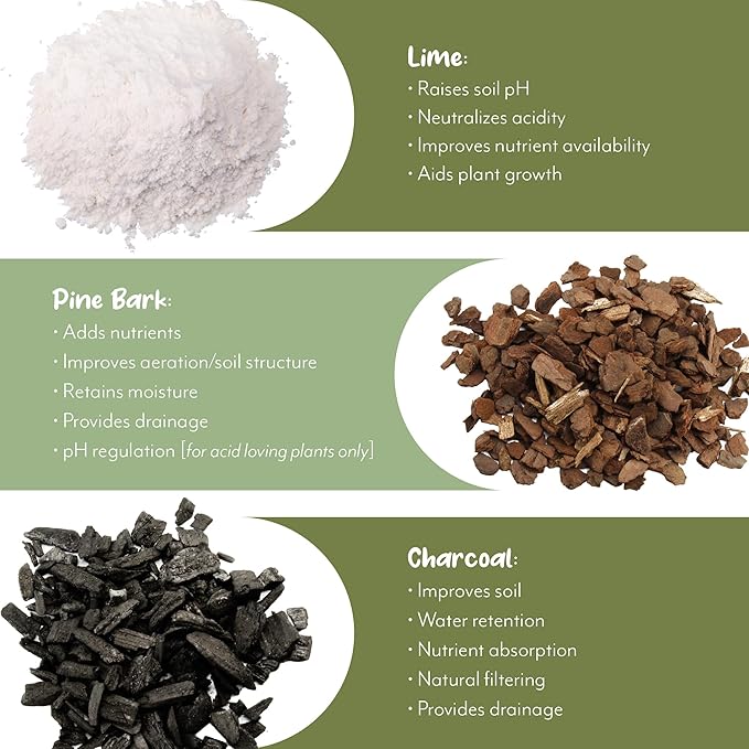 - Ingredients: Peat moss, pine bark, horticultural charcoal, horticultural perlite, sand, lime