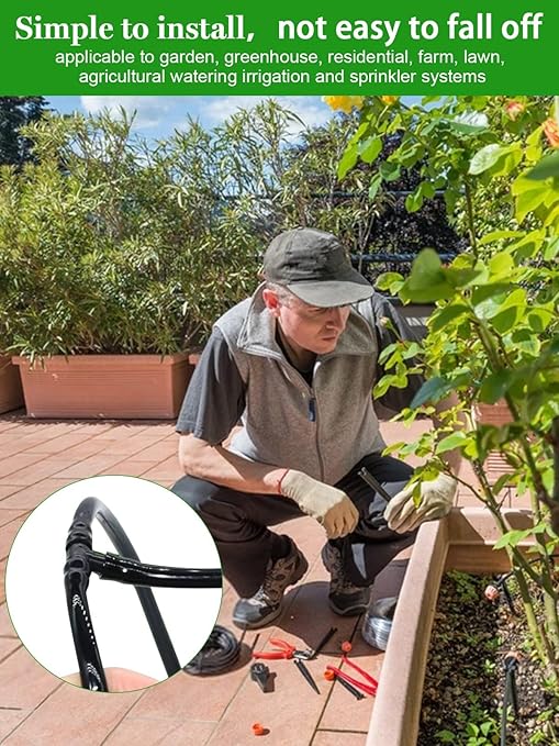 - Easy installation: It can be installed easily without glue, tools or fixtures. The irrigation fittings are anti-drop and can be tightly secured by simply pushing the tube into the barb. Before inserting, you can use a heat gun to soften the end of the pipe so that the connection will be firmer.