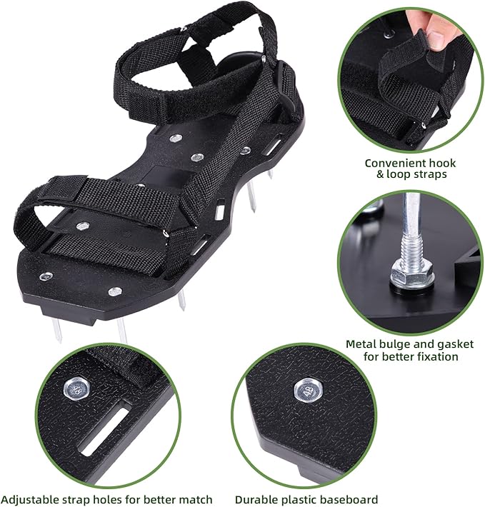 - Adjustable Size: Whatever your shoe size is, every pair of aerator shoes come with an adjustable hook & loop fasteners for the exact right fit. Both men and women can use these handy shoes to make lawn maintenance a breeze!