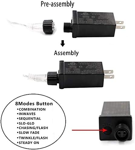 - 8 Modes & Multiple Choice: Press the button on the transformer to choose from the 8 different light effects: Combination, In Waves, Sequential, Slo-glo, Chasing/Flash, Slow Fade, Twinkle/Flash, and Stay On. Switch modes on demand, rich choice for you to create a beautiful and gorgeous festive atmosphere.