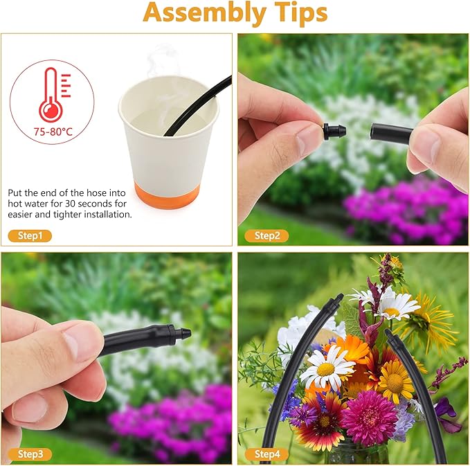 - ✔【Easy to Install】: After the straight piercing fittings are fully inserted at the end of the water pipe, the dripper or nozzle can be fixed without any glue, tools or clamps, easy to operate, and make gardening more convenient. Tips:Put the tubing end into 75°~80° hot water for 30 seconds before pushing them.