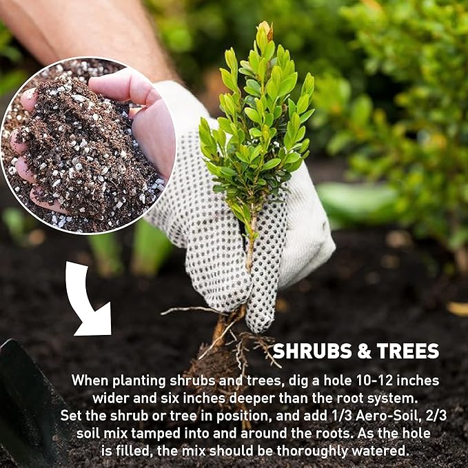 - SHRUBS & TREES - When planting shrubs and trees, dig a hole 10-12 inches wider and six inches deeper than the root system. Set the shrub or tree in position, and add 1/3 Aero-Soil, 2/3 soil mix tamped into and around the roots. As the hole is filled, the mix should be thoroughly watered.