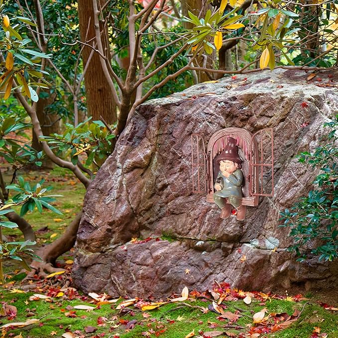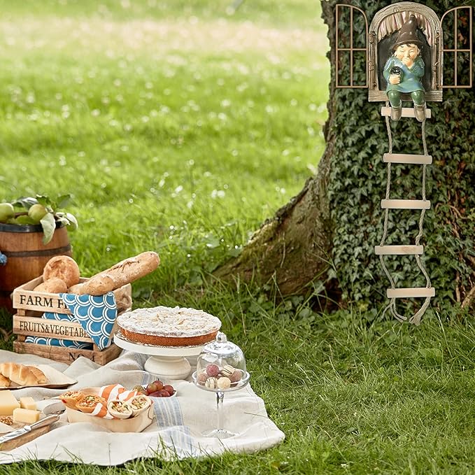 - Add interesting to your garden: you can hang these cute garden statue gnomes on your tree or fence that appear to be climbing out of a wooden window then down the ladder, plus a swinging metal windowpane which enhances a sense of reality to the sculpture furthermore; This combination is a nice way to add personality to any tree or to add interest to ordinary fences