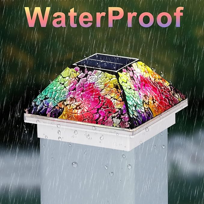 - 【Mosaic Design】The surface of solar post cap lights are covered with crackle mosaic glasses. Pure handmade means that each fence post solar lights are unique. The light will be reflected from the LED lights inside.
