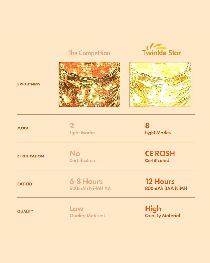 - 8 Lighting Modes with Memory Function: Our solar fairy lights for outside waterproof have 8 lighting modes for you to choose: combination, in waves, sequential, slo glo, chasing/flash, slow fade, twinkle/flash, and steady on. Comes with memory function, remember last setting automatically after turn off the power, no need to reset again.
