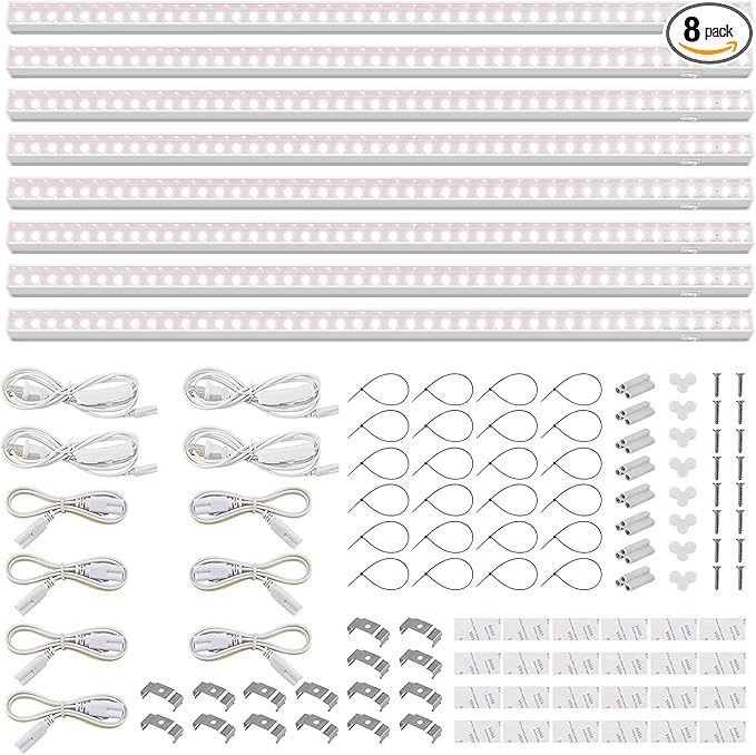 - What You Get - 8 x Barrina T5 Grow Lights, 4 x Power Cords with ON/OFF Switch, 7 x Connecting Cords(20''), 8 x Small Connectors, 16 x Installation Clips, 24 x Double-sided Tapes, 24 x Cable Ties