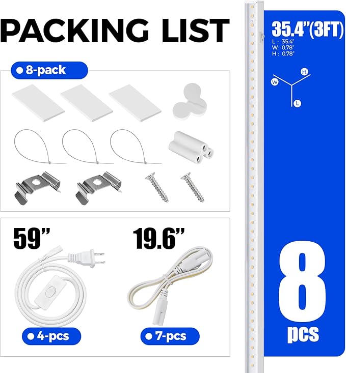 - What You Get - 8 x Barrina T5 Grow Lights, 4 x Power Cords with ON/OFF Switch, 7 x Connecting Cords(20''), 8 x Small Connectors, 16 x Installation Clips, 24 x Double-sided Tapes, 24 x Cable Ties