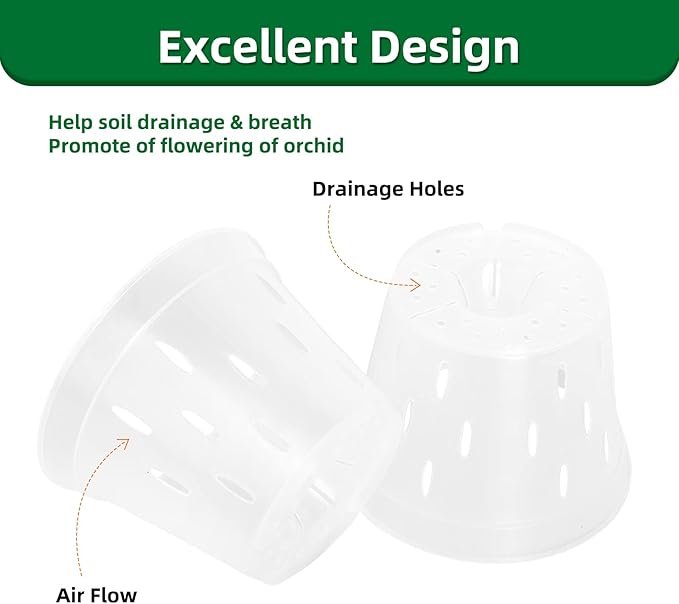 - Drainage Hole: Each orchid pots with holes, have lots of drain holes in the bottom and slits on the sides to increase drainage. Our orchid pots are designed for great drainage. It can better provide enough airflow and the required moisture level of the substrate. Thrive young and mature orchids in these clear orchid pots