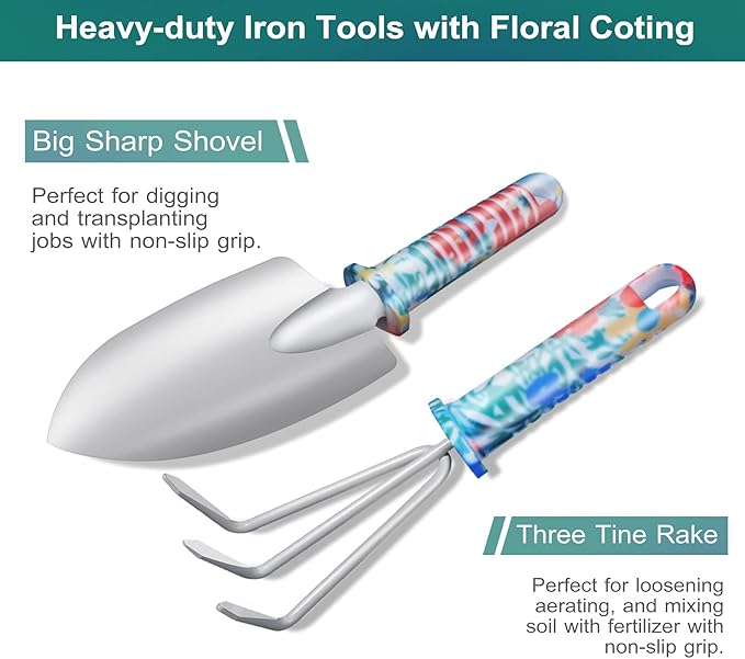 - Premium Material & Ergonomic Handle: The 6 metal gardening hand tools in your garden tool set are made of high-quality coated iron and heavy-duty stainless steel, extreme hardness, and no need to worry about breaking. Ergonomic rubber handles printed with floral patterns, no-slip grip handle reduces hand and arm fatigue, providing you with comfortable using experience