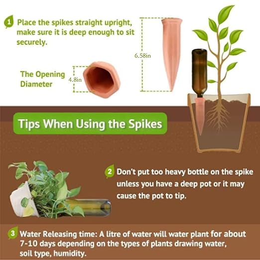 - Slow-release watering piles are for vacation use. There is no standard release time for spikes. Usually 1 liter of water can be watered for about 7-10 days. The release rate of plant watering depends on the size of the pot, soil composition, plant needs and climate. It is designed to prevent excessive watering and to ensure that people water when they go on vacation. Please test the release speed of the plant watering device before going out to protect the life of the plants.