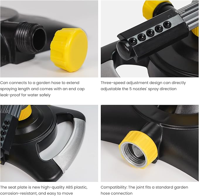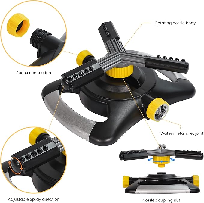- Time-Saving & Easy to Use-It only takes a few minutes to set up and start spraying, just fine-tune the angle of the rotating arm to provide gentle watering, you can enjoy leisure time at your own pace, don't worry about your garden lawn getting thirsty, this sprinkler is suitable for connecting to standard garden hoses
