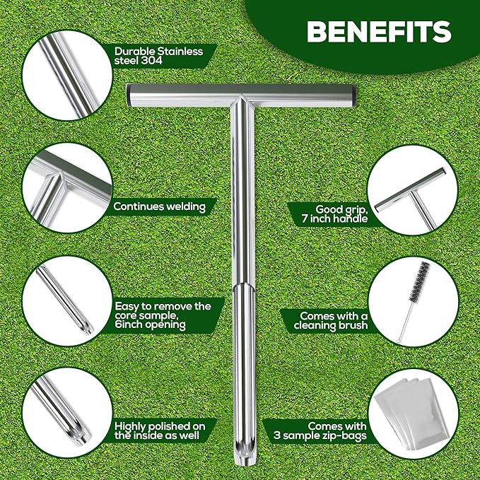 - Made to last - Made of Stainless steel 304. The tube is continuously welded between the 2 parts, which will make the soil sampler tool resist intense pressure and last lifelong.