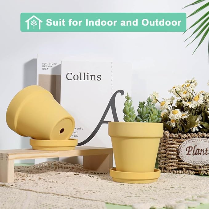 vensovo 4 Inch Small Yellow Terracotta Plant Pots with Saucer - 6 Pack Clay Flowerpots with Drainage, Great for Indoor Outdoor Plants, Crafts, Wedding Favor