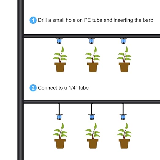 - Can be connected to a 1/4" tube, or drilling a small hole on PE tube and inserting the dripper, easy installation.