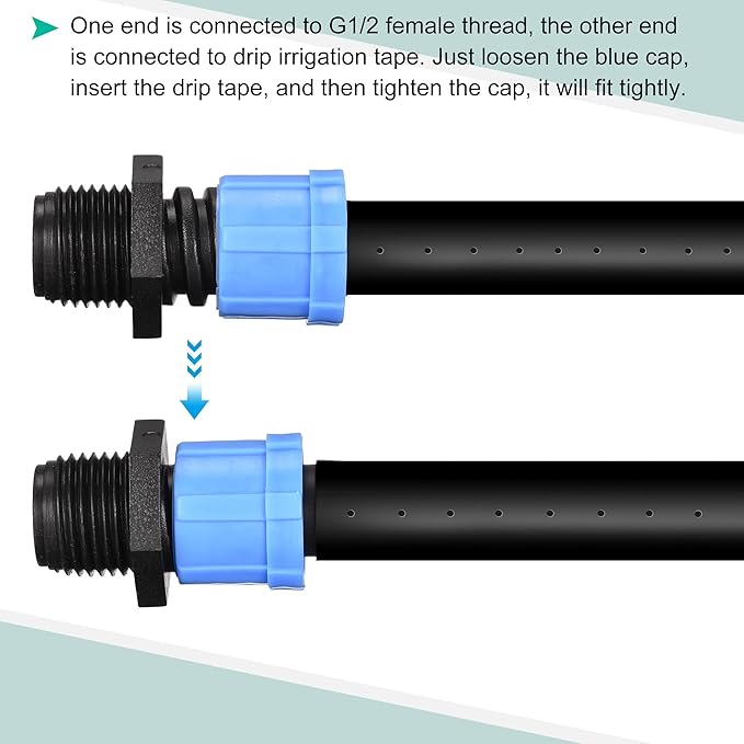 - One end is connected to G1/2 female thread, the other end is connected to drip irrigation tape. Just loosen the blue cap, insert the drip tape, and then tighten the cap, it will fit tightly.
