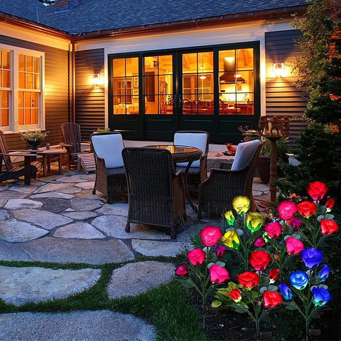 - 7 Color Changing Rose lights: Solar roses will slowly change in 7 different colors at night, they are like magic flower fairies lighting up your garden, paths and giving you a fantastic experience. During the day, these realistic decorative flowers are still very beautiful
