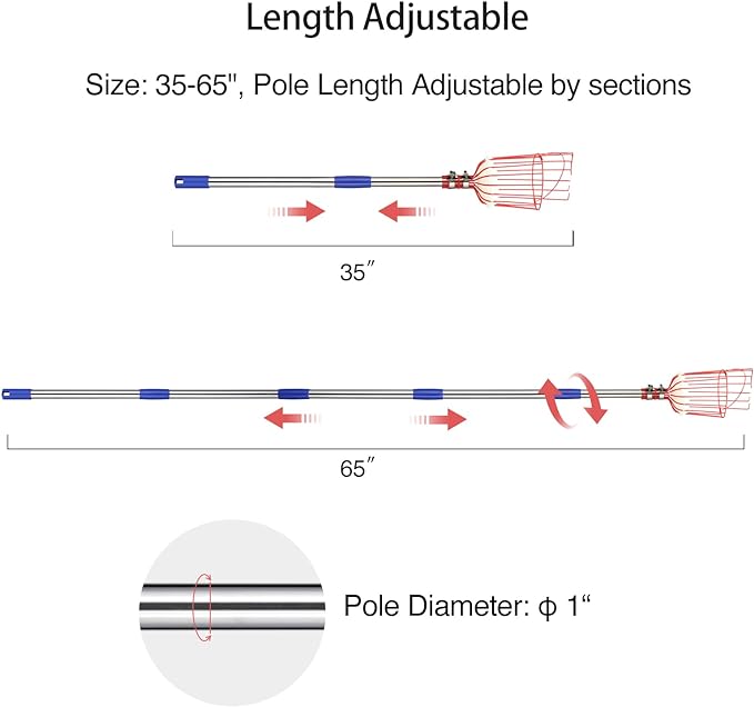 - ▼【Length Adjustable】Fruit tree picker length is adjustable to be 35",40“,65" (3ft-5ft)which is safer and more efficient to get fruit from tall trees without falling off a ladder any more.
