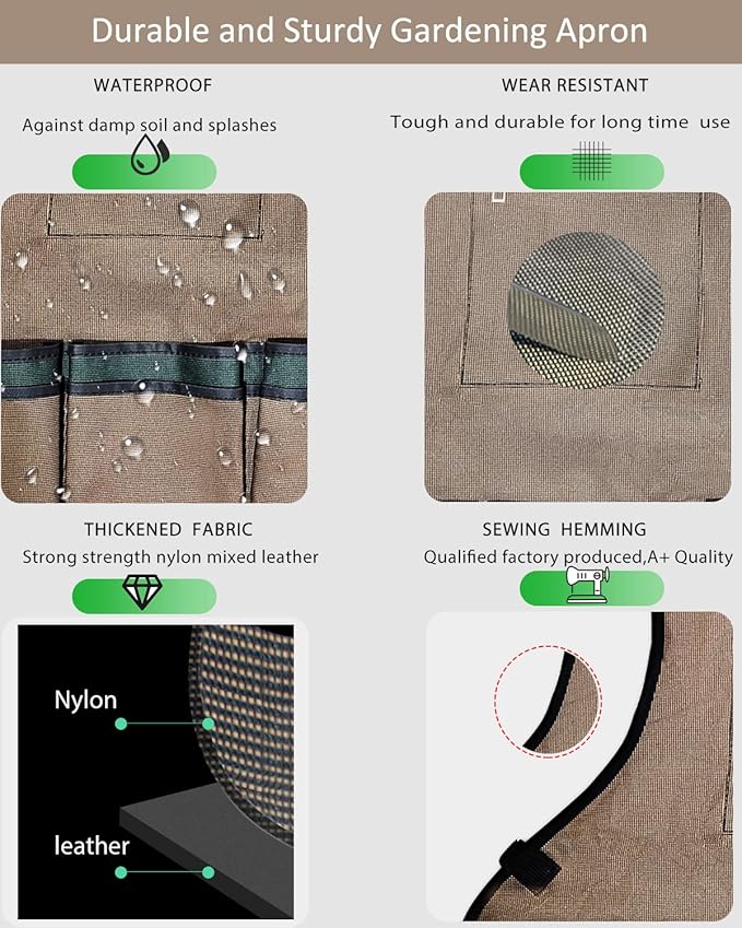 - Durable and Sturdy Gardening Apron-Made of premium nylon with strong strength, it is tough and durable for long time use.Waterproof fabric mixed protect against damp soil and splashes
