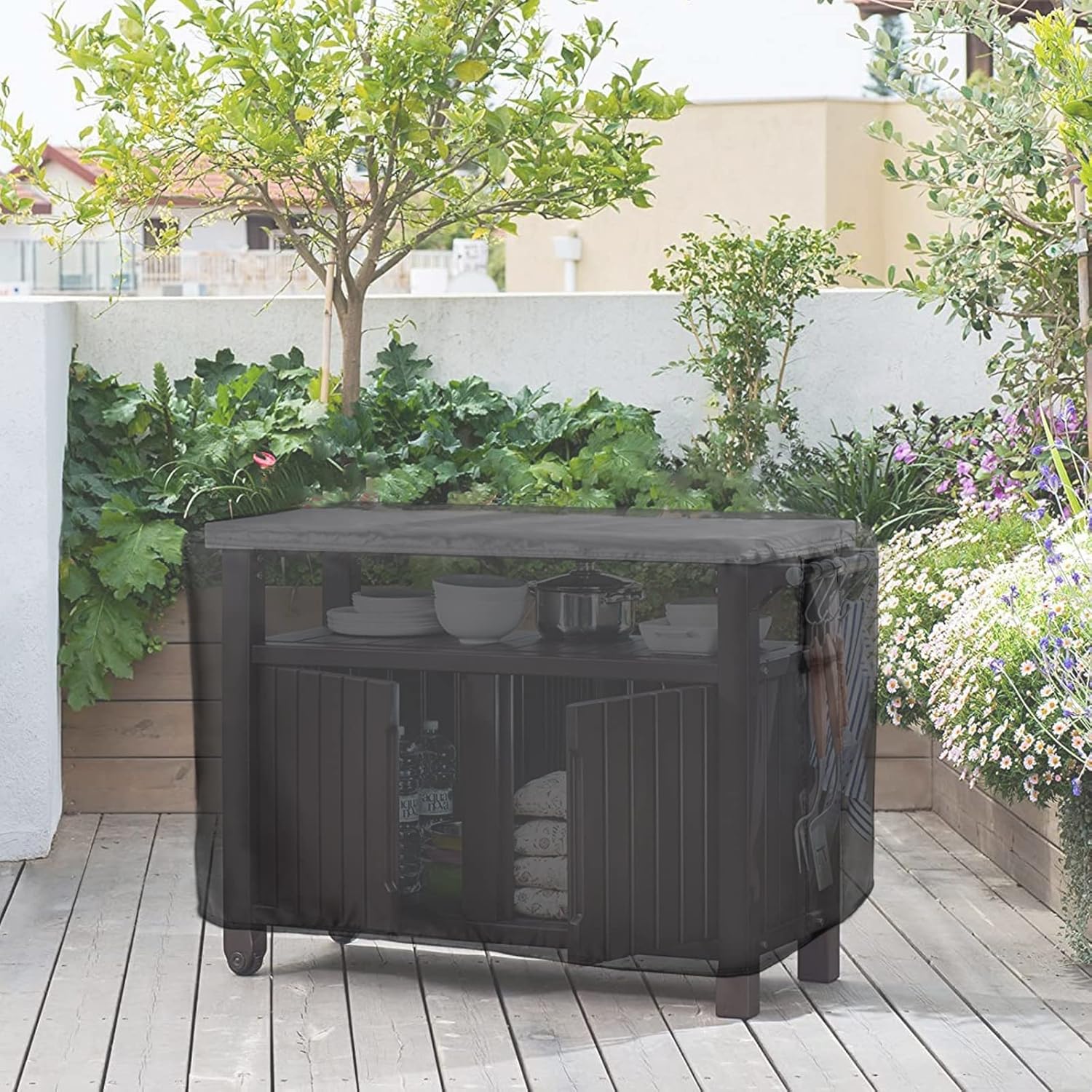 - Patio Table Cover Dimensions: 55"Lx24"Wx32"H. Patio prep table cover designed for Keter Unity XL portable outdoor table, for YITAHOME XL outdoor storage cabinet. Also compatible with similar size outdoor furniture, patio table, storage bench, freezer, prep table, outdoor bar, etc