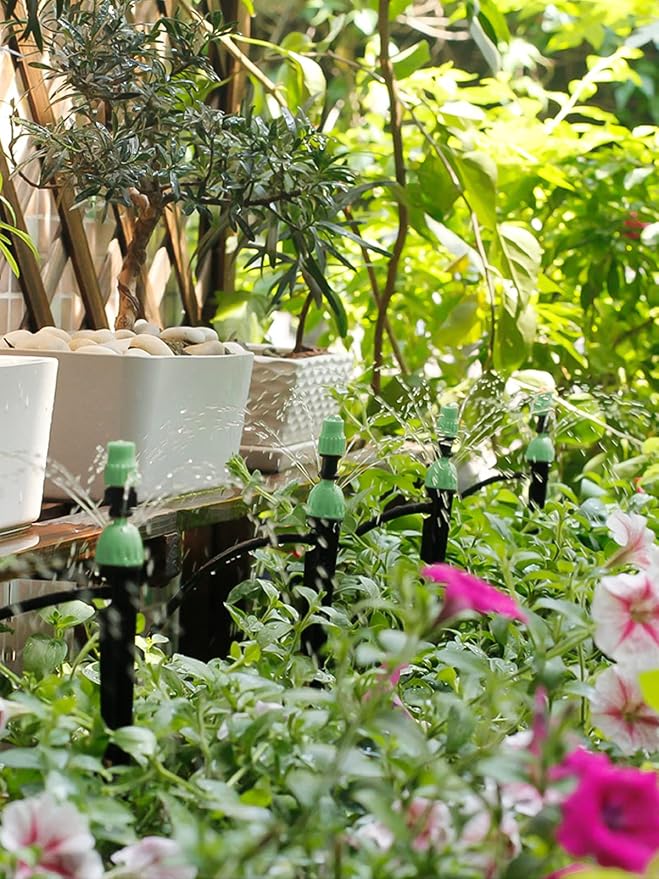 - ✔New Upgraded: Upgraded irrigation system dripper. The dripper and fixed rod are combined into one, the installation is more convenient, simple and fast Adjustable spray or drip irrigation modes, which allow each plant to be well looked after.