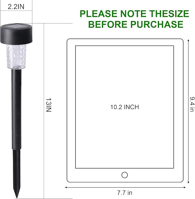 - PERFECT OUTDOOR DECORATIVE LIGHTS: These 10 pack garden lights can work normally under kinds of weather with the waterproof rating of IP44, no worries about little rain, snow, frost, or sleet. Our solar lights can be placed in the front, backyard, along driveway, walkway, sidewalk, around your patio or porch, adds a modern look for your outdoor lighting.