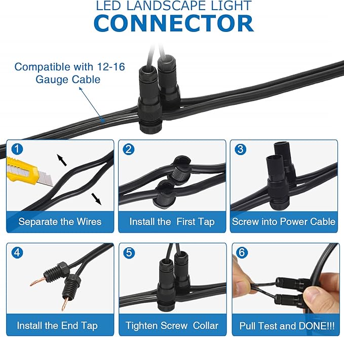 - 【Update Screw Tight Design Connector Ultra Hard Compared to others】 2 pairs of connectors, made from extremely hard nylon plastic with machined terminal brass pins and nickel coated to ensure your landscape lights work perfectly. NO Splicing/Crimping or tools required! Quickly and easily install two low-voltage cable to lighting fixtures in 5 minutes or less!