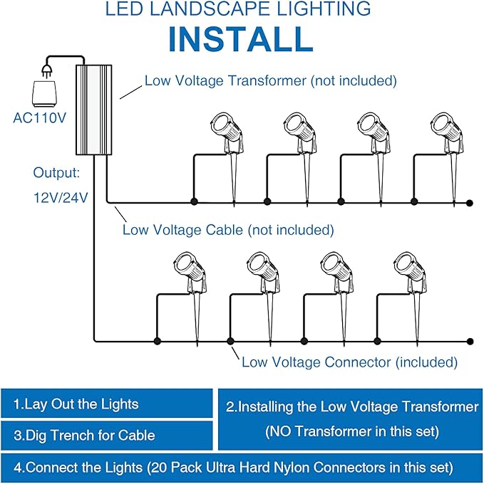 - 【Easy Installation】Just insert the light spike stand into the suitable position on ground, then use our fastlock connectors to connect landscape lighting fixtures. Extra accessories needed: transformer, low voltage wires( NOT INCLUDED in this pack)