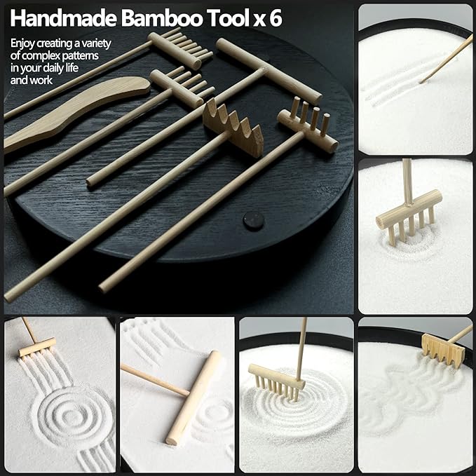 - 🎀Boost Your Creativity - With this unique and ever-changing mini zen garden, you are a designer. With 6 exquisite bamboo rake tools, you can freely master complex patterns and designs, and transform it over and over again according to your wishes. There are endless choices for healing interaction with sand, and experience the tranquility of relieving stress with zen garden kit, bringing you more fun.