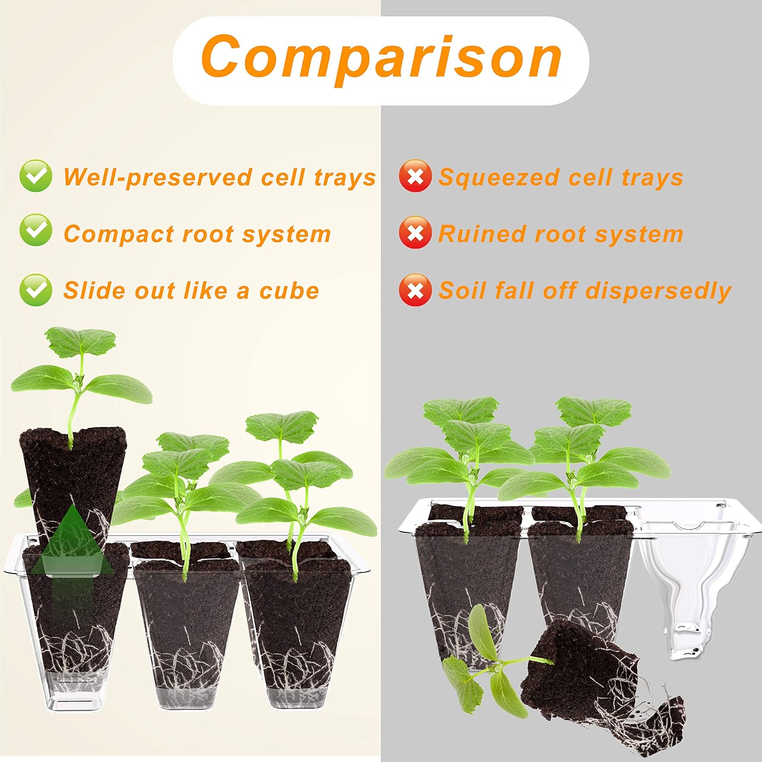- Ejector Seedling Tray VS Traditional Transplant - Traditionally transplanting will squeeze the seedling starter trays and spill out their contents, in which medium goes everywhere exposing the tender roots, and high risk causing a shock to the plants system. But with "ejection method", you just push the base from the bottom and out comes everything painlessly and safely.