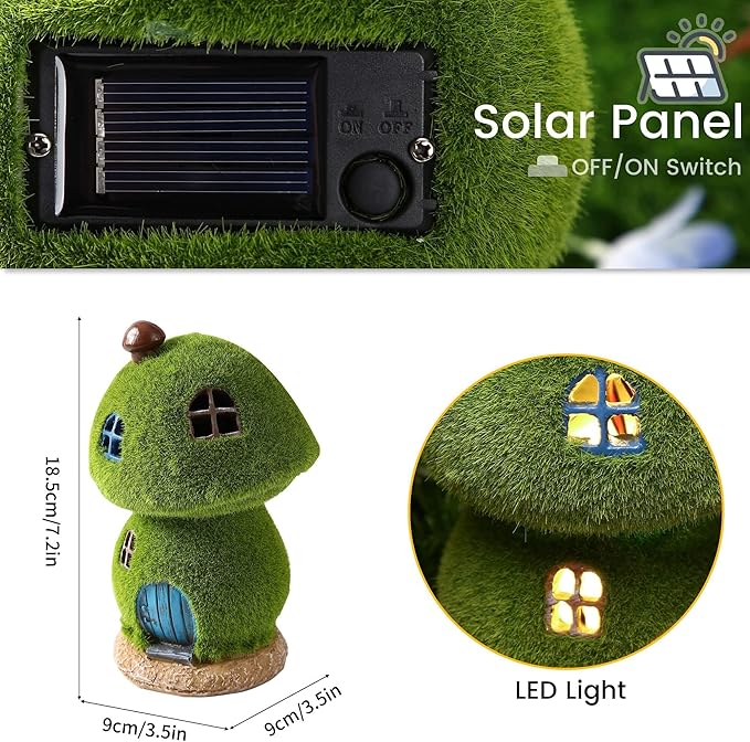 - The charming mushroom house statue is powered by a tiny solar panel at night, glowing warm white. Very beautiful fairy house outdoor solar lights is a wonderful addition to the garden, swimming pool, lawn.