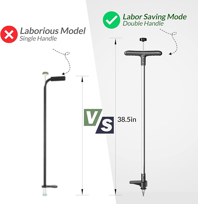 - Standup Weeding Tool For a Better Gardening Experience: Get rid of weeds without risking your back with this long handled lawn weeding tool. The 38” tall handle lets you uproot the weeds without having to bend over or go down to your knees. The foot pedal lets you put enough force on the gardening weed extractor to penetrate the ground and grab the whole weed, including the roots, so it doesn’t grow back. It is good tools for your garden, backyard, frontyard landscaping.