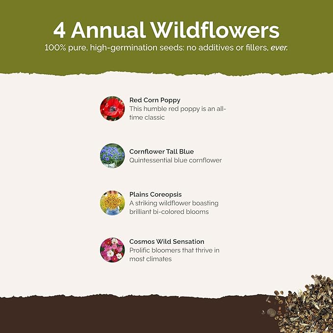 - 100% Pure, Non-GMO Seeds - No fillers, favorites only! Includes 5 easy-to-grow species: Blue Cornflowers, Coreopsis, Cosmos Sensation Mix and more